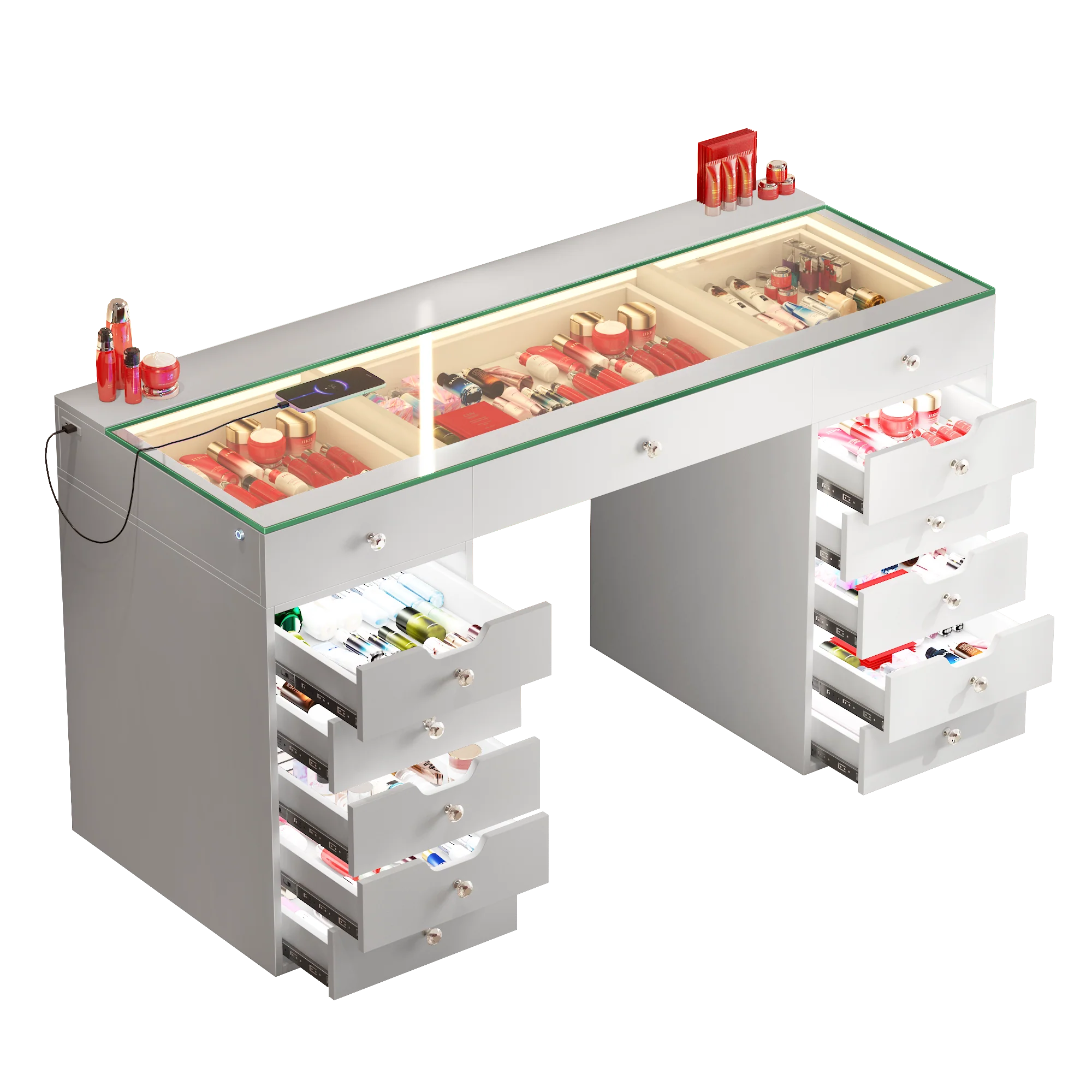 This sleek and modern Eva Vanity Desk offers the ultimate in beauty organisation and functionality. With 13 spacious storage drawers and a large glass-top layout, your entire makeup collection can be elegantly displayed and stored. Featuring a built-in LED light strip across the top with adjustable brightness and colour temperature, you’ll have perfect lighting for every look.